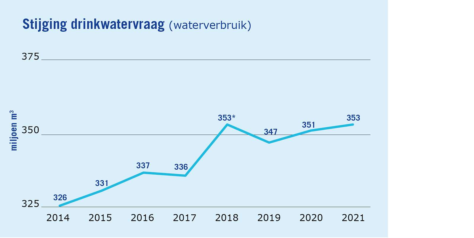 Op basis van strategische analyses verwachten we dat de jaarlijkse drinkwatervraag in 2021 in totaal 16,4 miljoen m3 hoger ligt dan in 2017 (plan 2021: 352,5 m3, werkelijk 2017 op basis van 99,4 procent gefactureerd: 336,1 m3). Om aan de stijgende vraag te voldoen, zijn investeringen nodig in de win- en distributiecapaciteit.